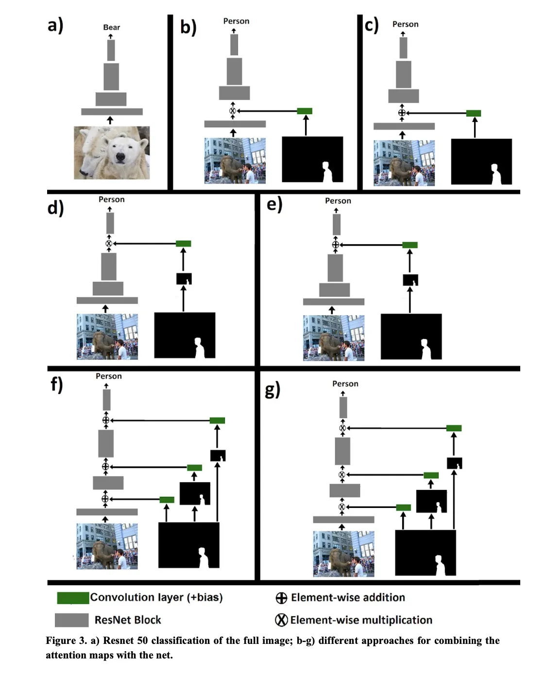 In order to allow element-wise addition or multiplication, the attention map must be the same size as the layer with which it is combined. To achieve this, the ROI mask was first resized to match the size of the layer with which it was merged, and a convolution layer was then applied with the same number of filters as the depth of the target layer.