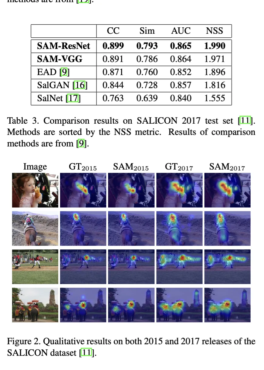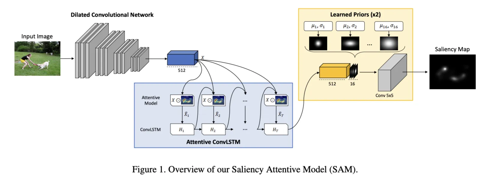 We recently proposed a Saliency Attentive Model (SAM) which, in contrast, incorporates attentive mechanisms to iteratively refine saliency predictions. Overall, it is composed by three main components: a Dilated Convolutional Network that extracts feature maps from the input image, an Attentive Convolutional LSTM which recurrently enhances saliency features and a learned prior module that incorporates the human-gaze center bias in the final predictions