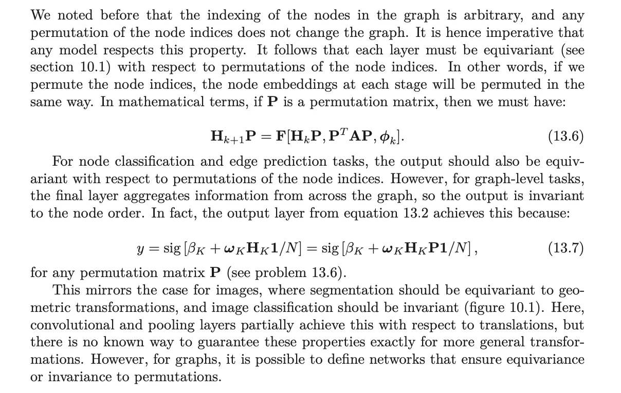 Equivariance and Invariance for Graphs Equivariance and Invariance for Graphs if we permute the node indices, the node embeddings at each stage will be permuted in the same way.