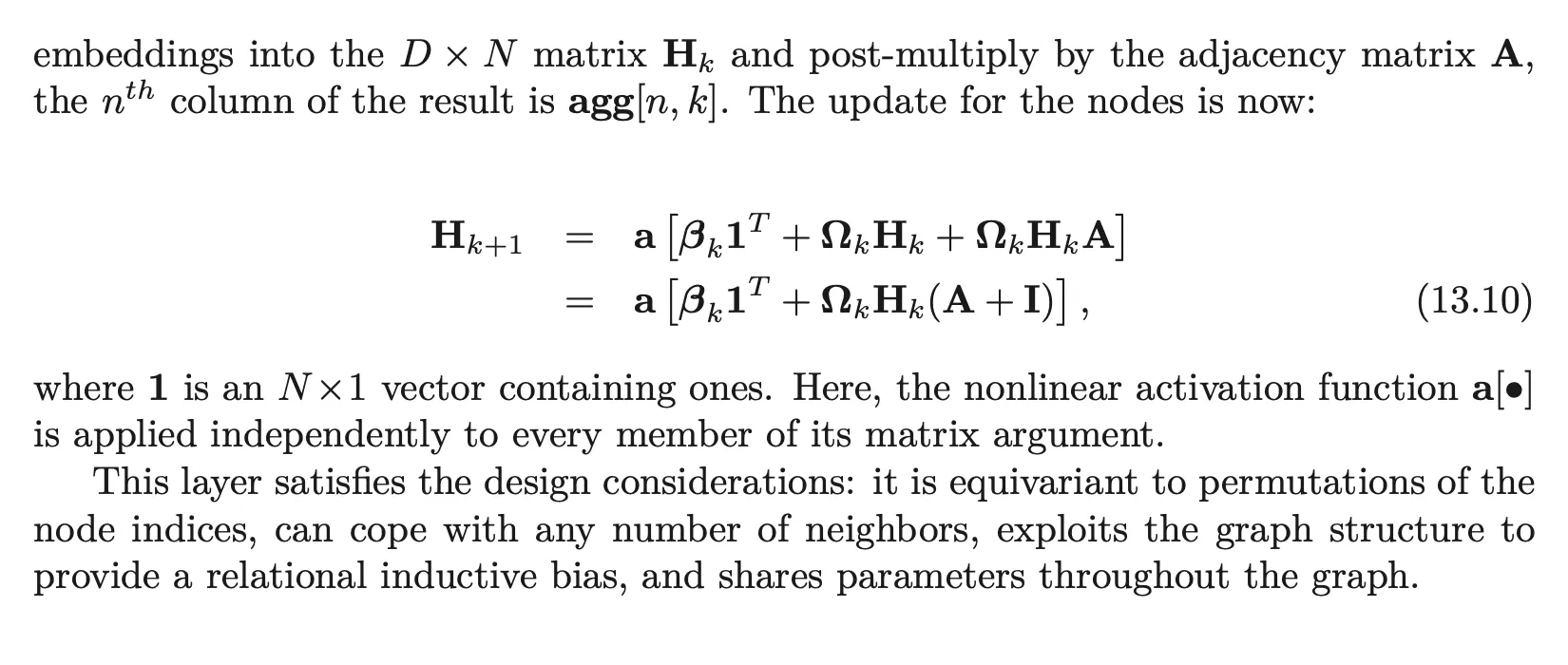 - this is equivariant, can cope with any number of neighbors, uses the graph srtucture to provide a Relational Inductive Bias and parameter sharing
