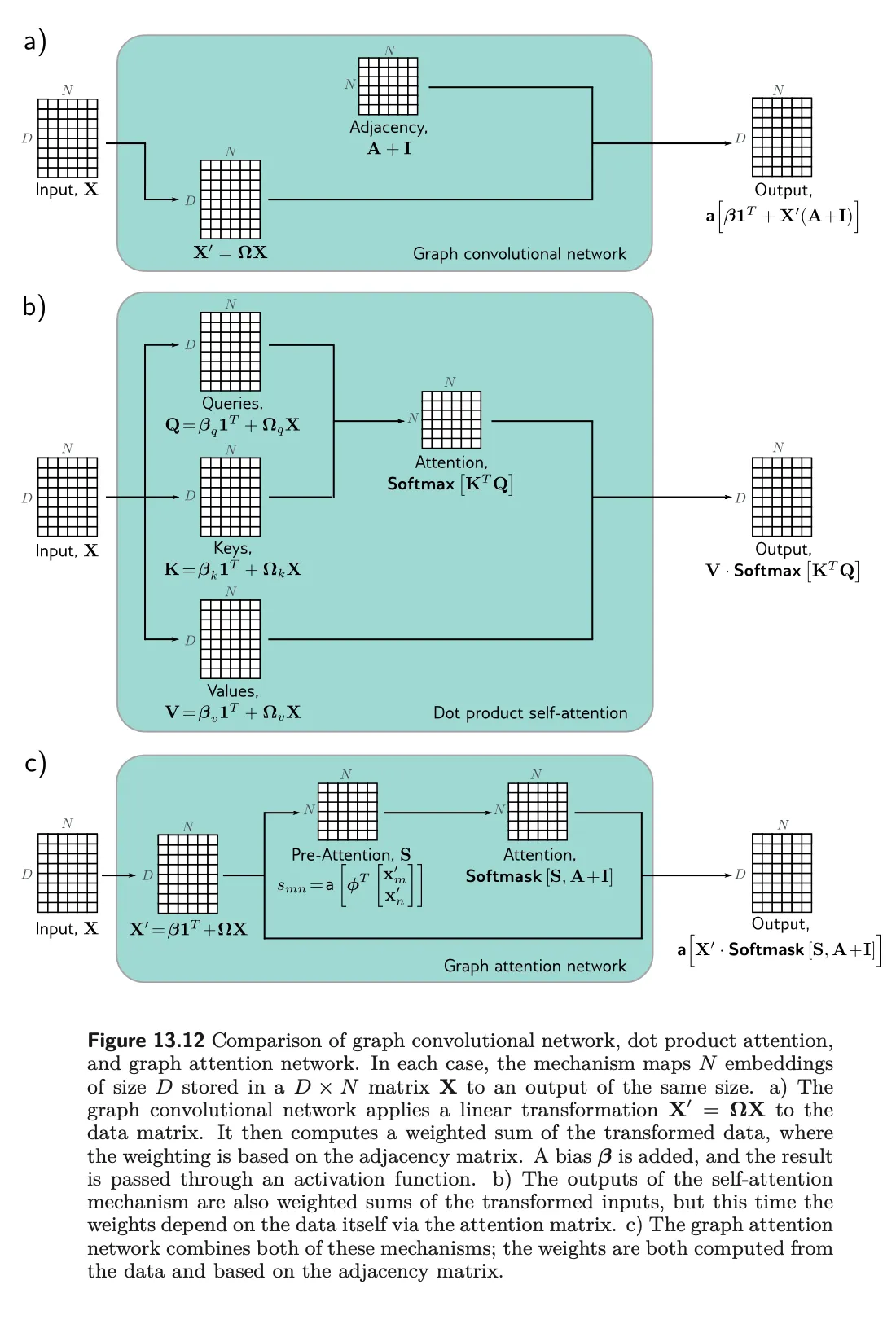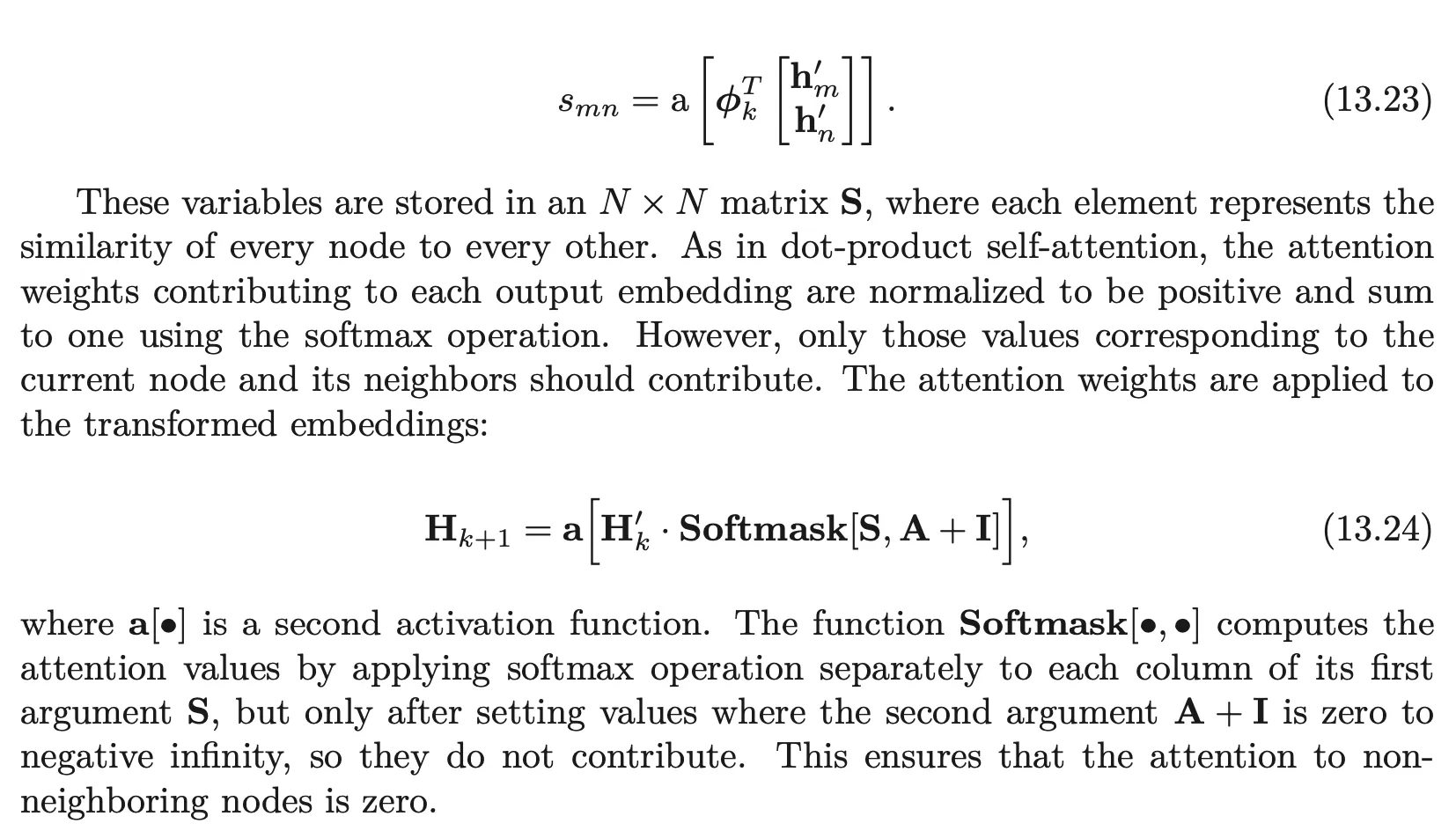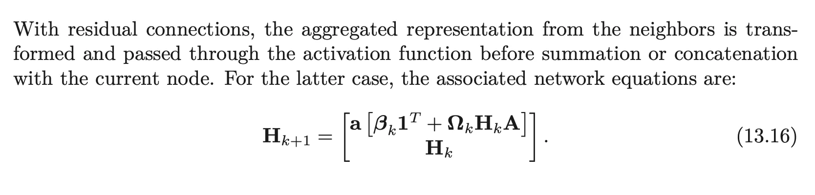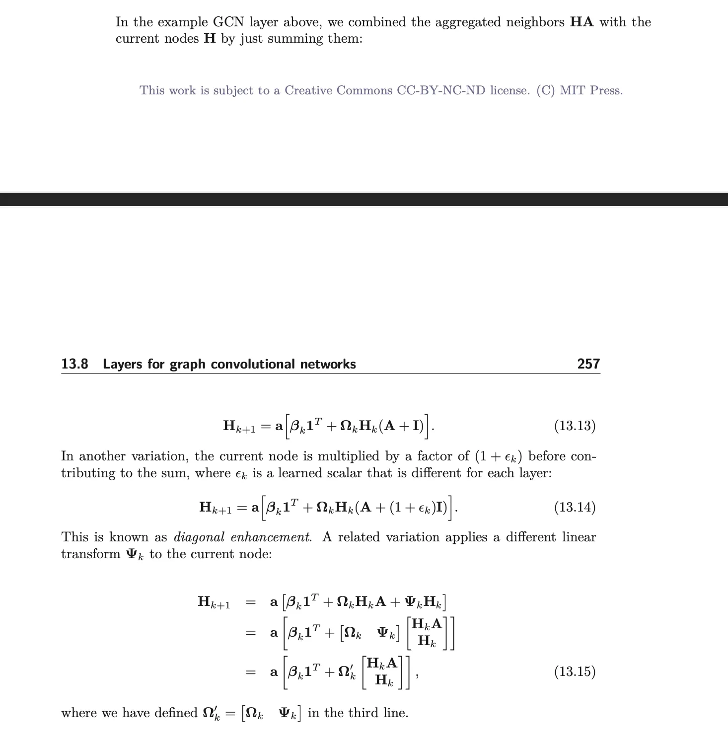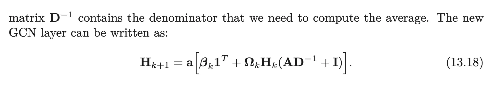 combined messages from adjacent nodes by summing them together with the transformed current node → post-multiplying the node embedding matrix H by the adjacency matrix plus the identity A + I