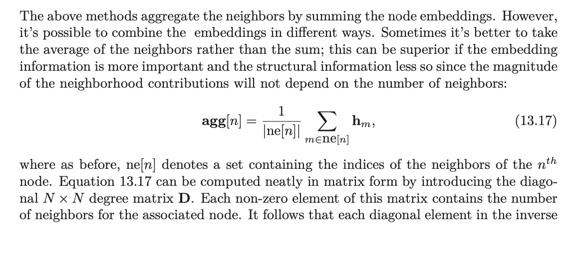 Sometimes it’s better to take the average of the neighbors rather than the sum; this can be superior if the embedding information is more important and the structural information less so since the magnitude of the neighborhood contributions will not depend on the number of neighbors