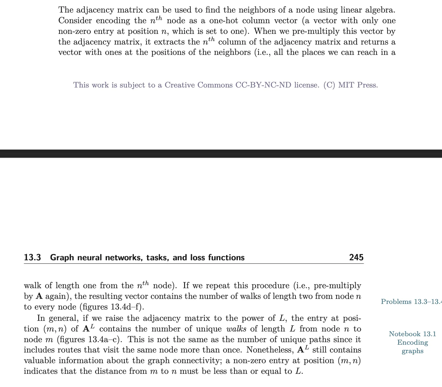 if we raise the adjacency matrix to the power of L, the entry at position (m,n) of AL contains the number of unique walks of length L from node n to node m