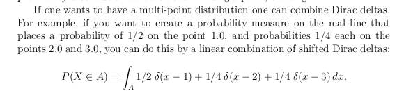 Dirac Delta -P(X∈A)=⎩⎨⎧10if 0∈Aif 0∈/A P(X∈A)=∫Aδ(x)dx In Rn it is a PDF which describes prob concentrated in the origin Multi Point Distribution → combine dirac deltas