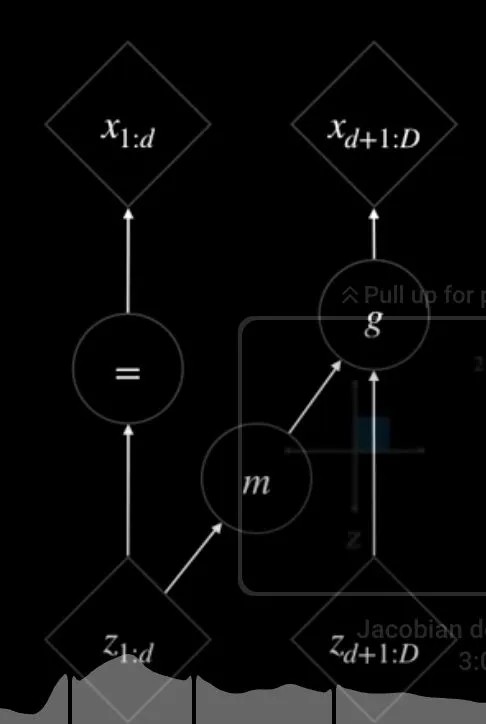 - to invert them is trivial \begin{align*} z_{1:d}= x_{1:d} \\ z_{d+1:D}= g^{-1}(x_{d+1:D}; m(x_{1:d})) \end{align*}