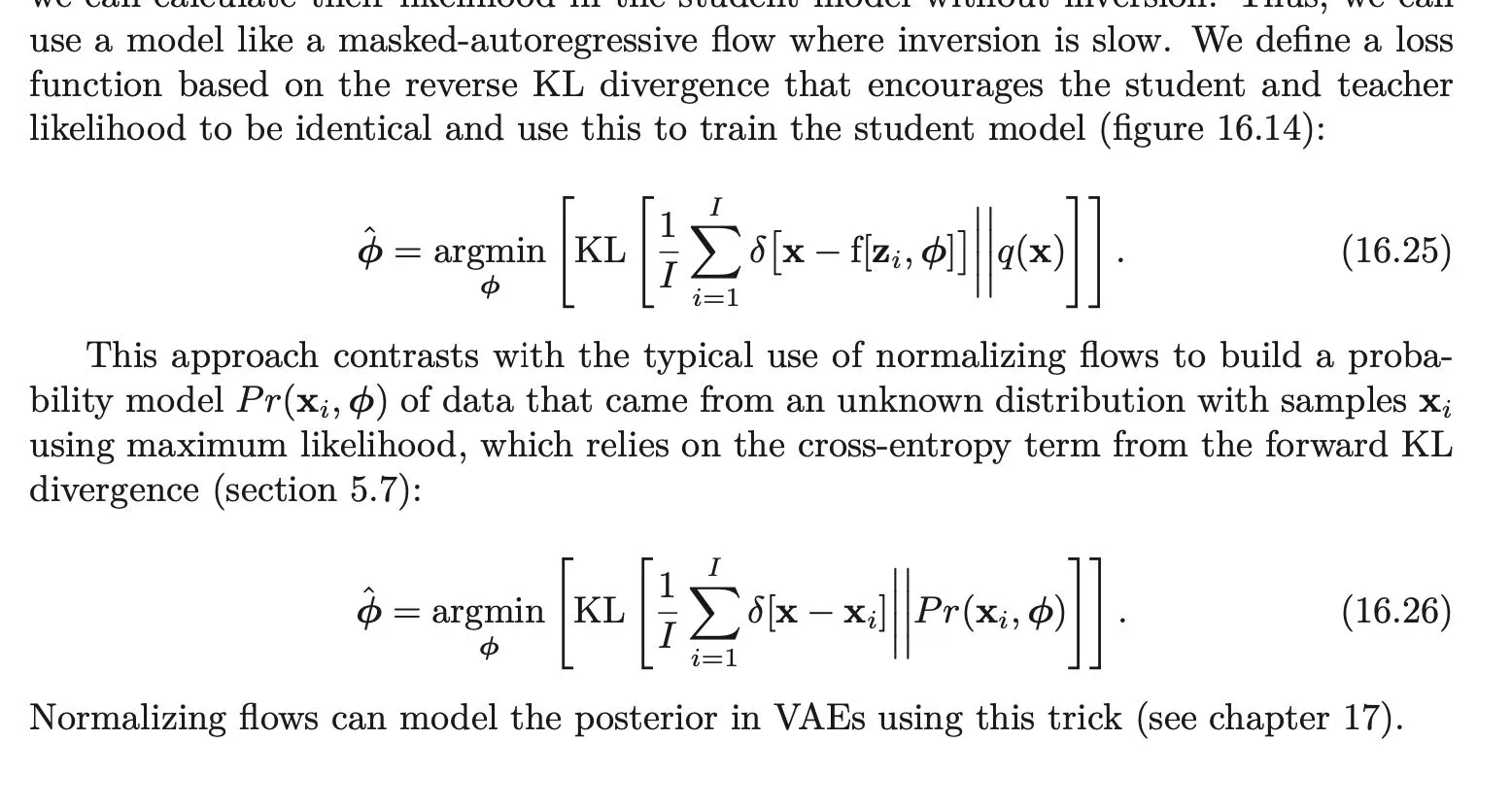 - A trick that allows fast learning and also fast (but approximate) sampling is to build a masked autoregressive flow to learn the distribution (the teacher) and then use this to train an inverse autoregressive flow from which we can sample efficiently (the student)
