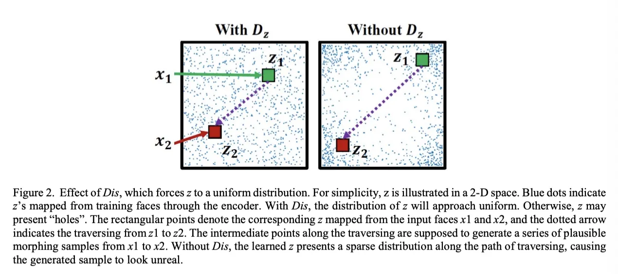 Such adversarial process forces the distribution of the generated z to gradually approach the prio uniform distribution as the prior, forcing z to evenly populate the latent space with no apparent “holes”. the generated z’s (depicted by blue dots in a 2-D space) present uniform distribution under the Regularization(regularization.qmd) of Dis, while the distribution of z exhibits a “hole” without the application of Dis Exhibition of the “hole” indicates that the samples generated by interpolating between arbitrary z’s may not lie on the real image manifold – generating unrealistic appearancesnot to generate photorealistic images as in GAN offer more informative and discriminative training sample, the adversarial loss in pixel-level is dropped in here for faster training and processing.
