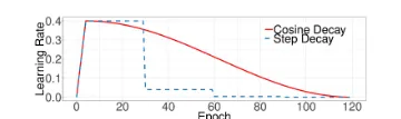 Cosine Learning Rate Decay Instead of Learning Rate Warmup and then decay ηt=21(1+cos(Ttπ))η Rate decreases slowly at first, then almost linear in the middle and slows down again in the end