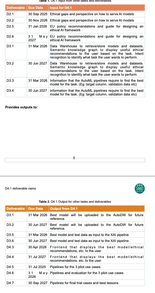 | Task T3.4 is strategically positioned to revolutionise the landscape of AI algorithmdevelopment by introducing automated processes that ensure unbiased models while adhering to the EU regulatoryframework. Leveraging state-of-the-art techniques such as AutoML, transfer learning, and meta-learning, this taskfocuses on the efficient selection of AI models and pipelines. By automating the model recommendation process, theplatform ensures optimal model performance for identified use cases, promoting efficiency and accuracy in algorithmselection. To democratise the use of AI algorithms, the task involves the automatic generation of wrapper code foridentified use cases. This includes facilitating zero-shot use of Large Language Models (LLMs) and adapting or fine-tuning algorithms on new data. The goal is to make AI development more accessible and user-friendly, promoting theadoption of advanced AI technologies across diverse domains. Furthermore, recognizing the paramount importance ofaligning with regulatory frameworks, the task ensures that the AutoML processes developed within ALFIE complywith existing and upcoming EU regulations, particularly those outlined in the AI Act. This includes robust measuresto address ethical considerations, data privacy, and transparency in algorithmic decision-making. Beyond compliance,T3.4 takes a proactive stance by proposing policy measures that support the responsible and ethical use of no-code AIand related tools. This involves providing guidelines and recommendations to policymakers to foster an ecosystemwhere AI technologies contribute positively to society while mitigating potential risks. Roles: TU/e will lead the task deploying the appropriate tools for the auto-generation of AI tools, EHU will support data privacy and connectionwith the Semantic Knowledge Graph. KInIT will supervise the task as WP leader and provide guidelines to connectwith the interaction layer. UoB will be responsible to connect the auto-generation layer with evolving AutoML toolsT3.5 Evolving AutoML algorithms by involving humans in the loop (M5- M33) [lead: UoB; contrib: DAS, TU/e] |