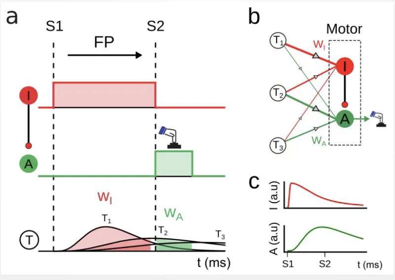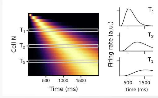 - Different ‘Time cells’ and ‘motor inhibiton & activation’ are active at the same time: this leads to hebbian learning