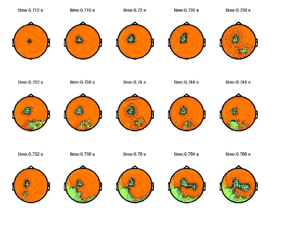 There was a significant difference between easy and more difficult trials between 712 ms post-stimulus and 768 ms post-stimulus. This difference was initially localized to a few central electrodes but over time spread out more posteriorly. This is consistent with previous studies that have shown